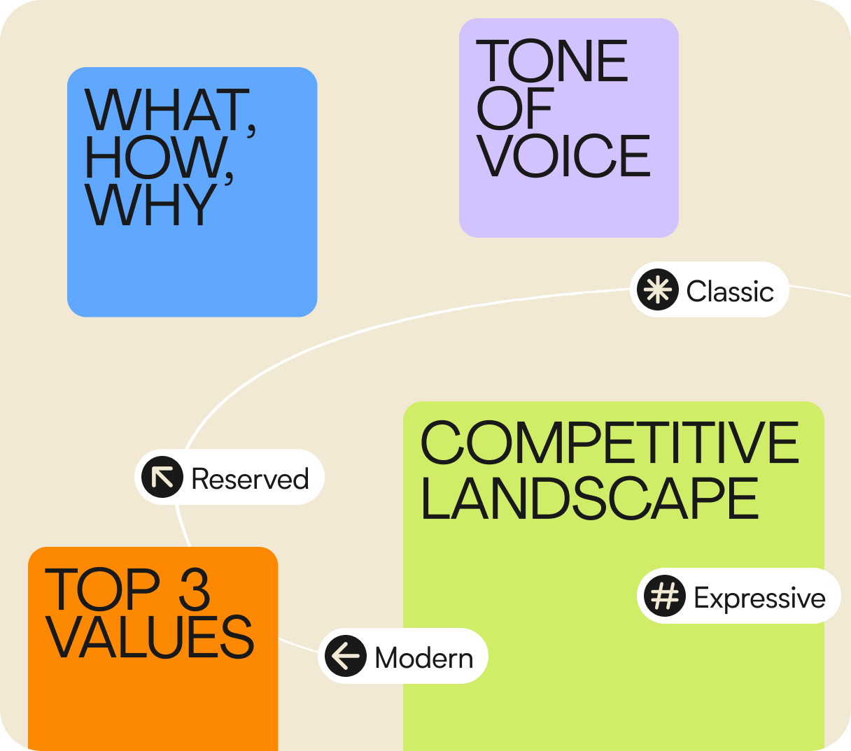 Our classic branding process is a slower, more expansive journey. It often involves more stakeholders, more research, more layers — and more time. This approach can be great for large organizations with complex needs.